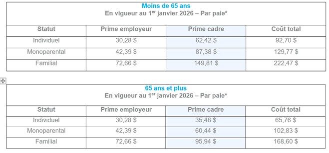 Le coût total augmente de 4 %, principalement en raison des coûts des médicaments.Il est à noter que la tarification est différente en fonction du groupe d’âge (moins de 65 ans ou 65 ans et plus) pour tenir compte de la prime payée pour le régime public d’assurance médicaments à partir de 65 ans.